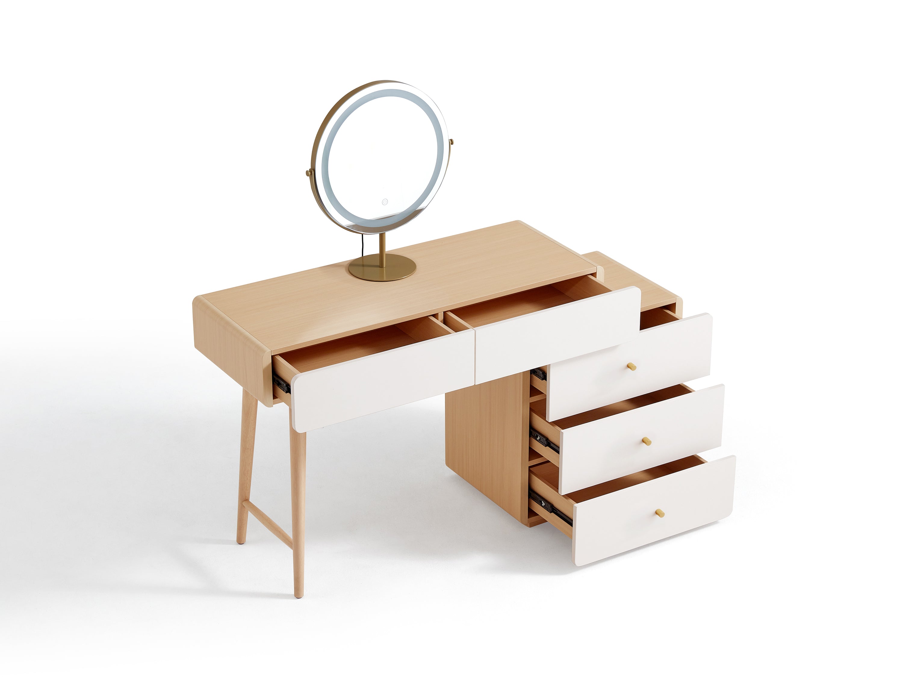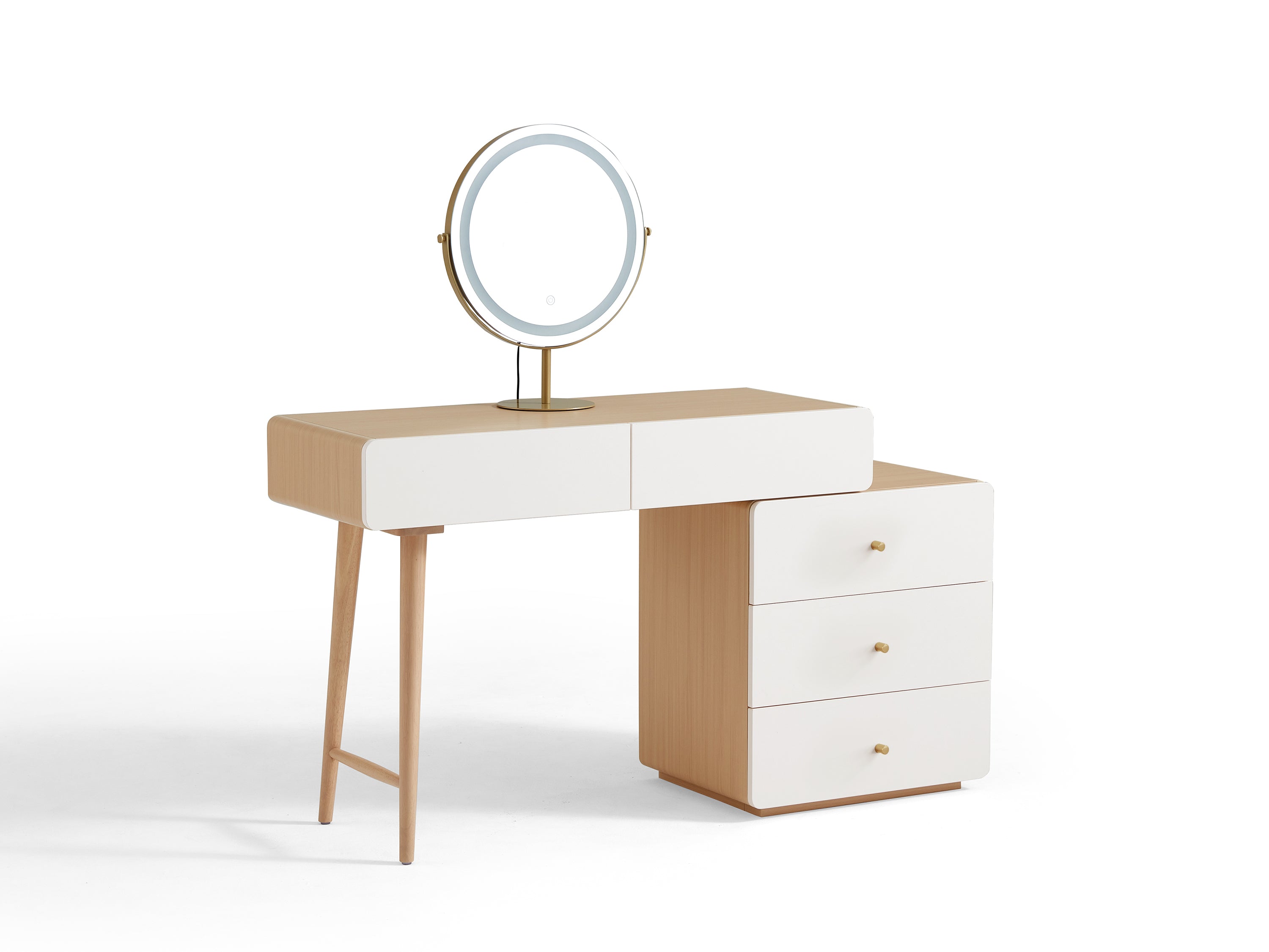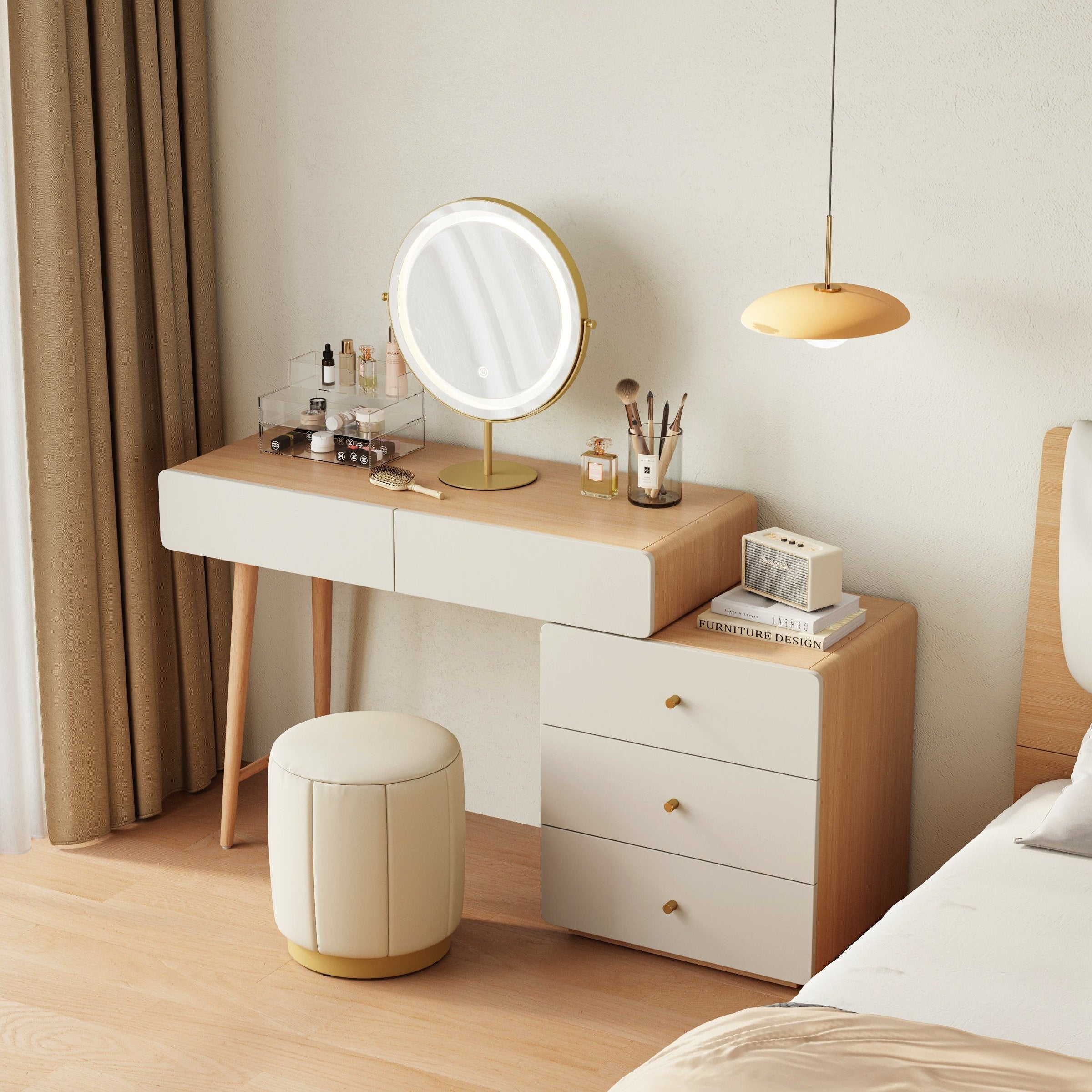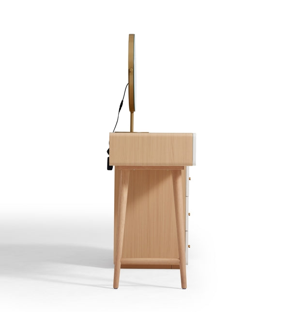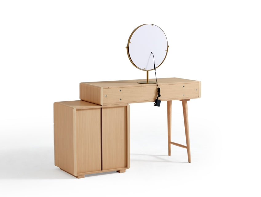 Elevate your beauty routine with this minimalist vanity set in natural wood. Featuring a sleek mirror and comfortable stool, this stylish set offers ample storage for your essentials while enhancing your space with its clean, modern design. Perfect for any bedroom or dressing area.