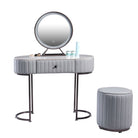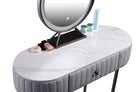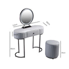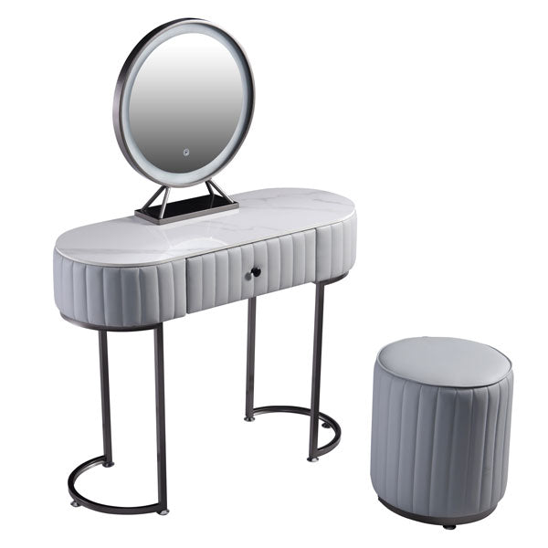 Introducing our Vanity Dressing Table Set, featuring a slate stone tabletop with PU leather-wrapped side cabinets and layered drawers for storage. It includes a metal frame for stability, a comfortable stool, and a mirror with integrated lighting for optimal grooming. This set combines functionality with elegant design, ideal for enhancing your bedroom or dressing area!