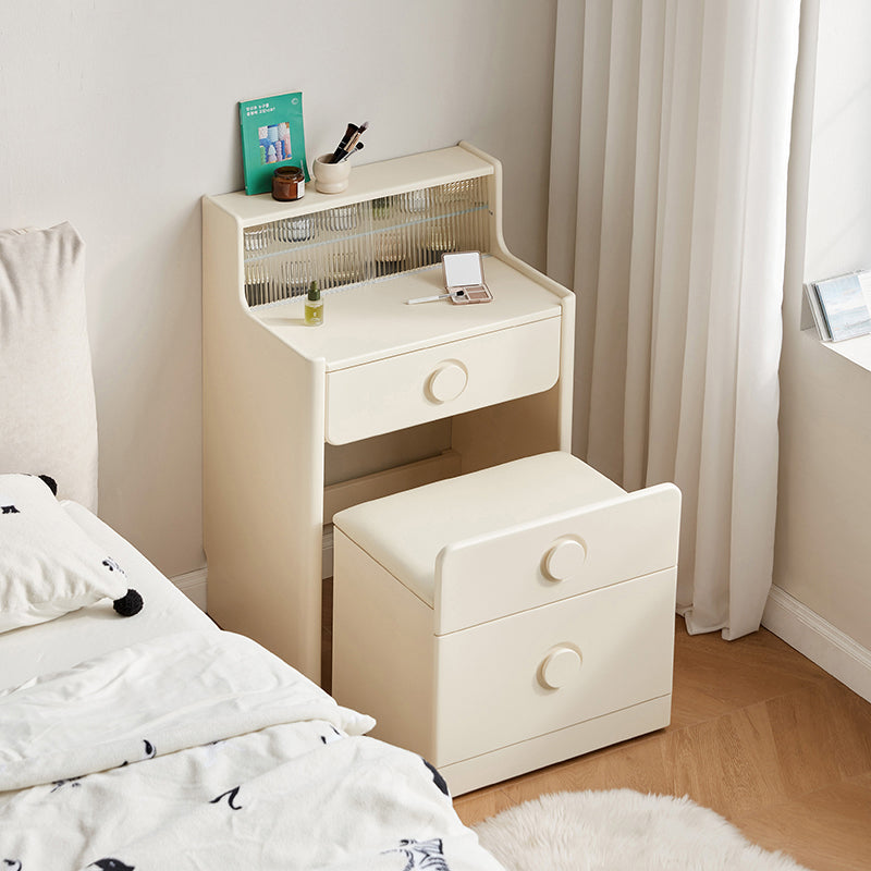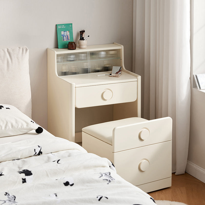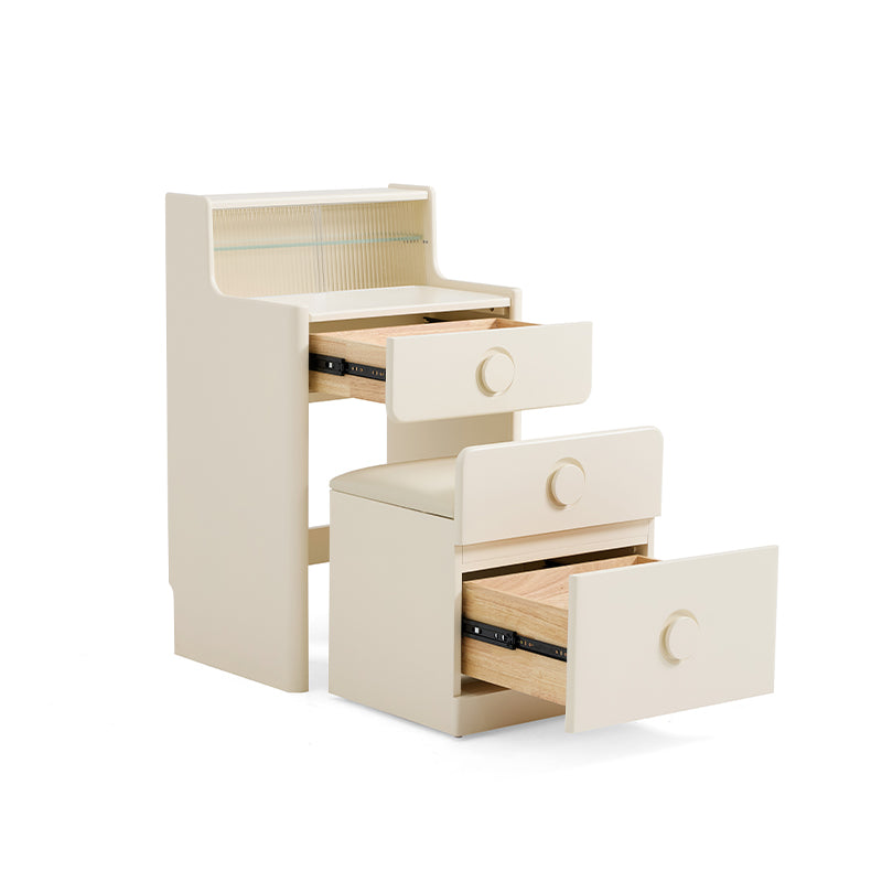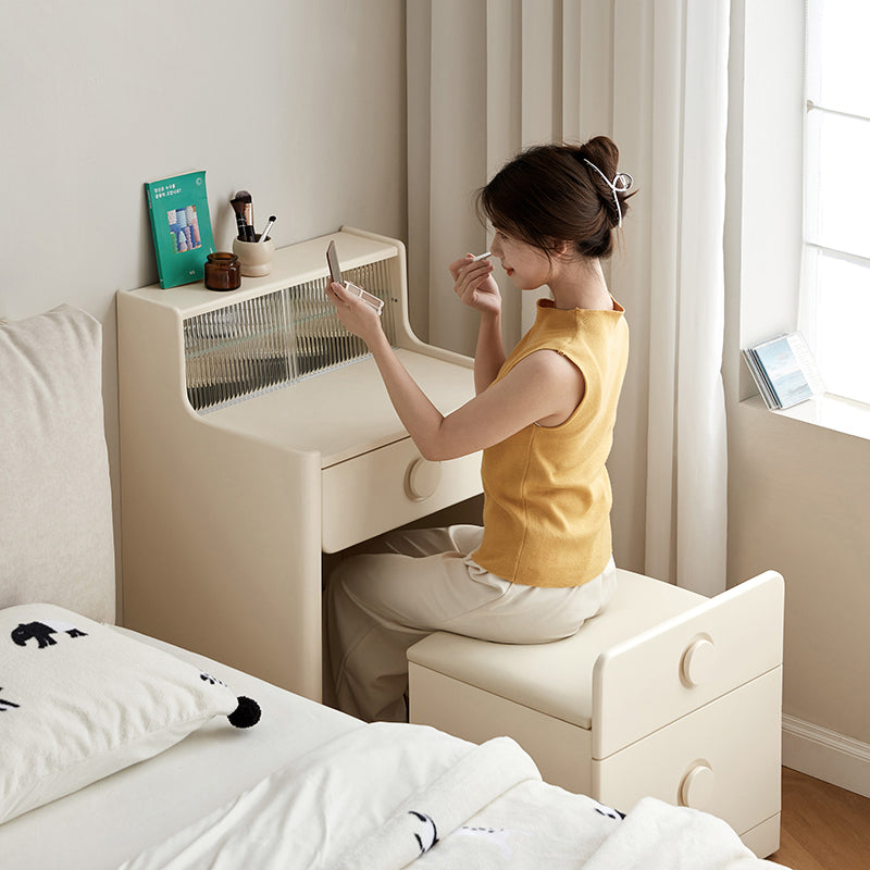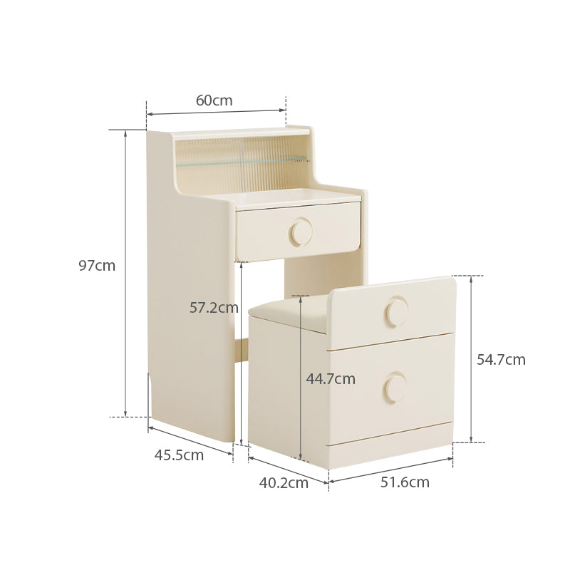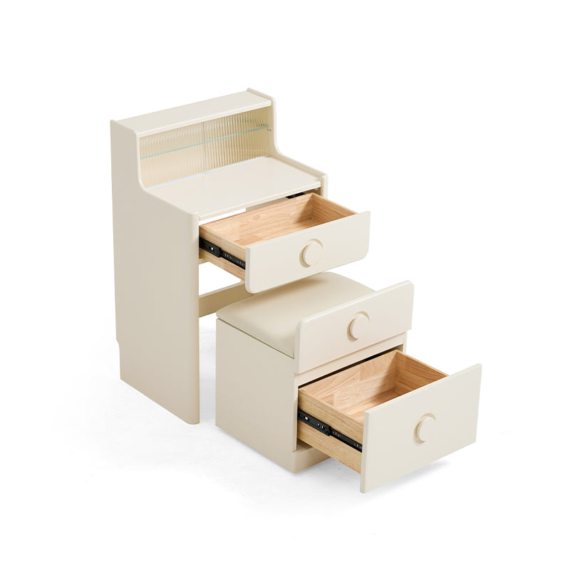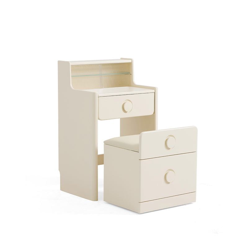 Compact & Clever! This all-in-one vanity set combines a table and matching stool in one space-saving unit. The stool neatly nests under the table when not in use, freeing up floor space. Featuring a smooth desktop for your beauty essentials and mirror placement, it's perfect for small bedrooms or apartments seeking stylish functionality.