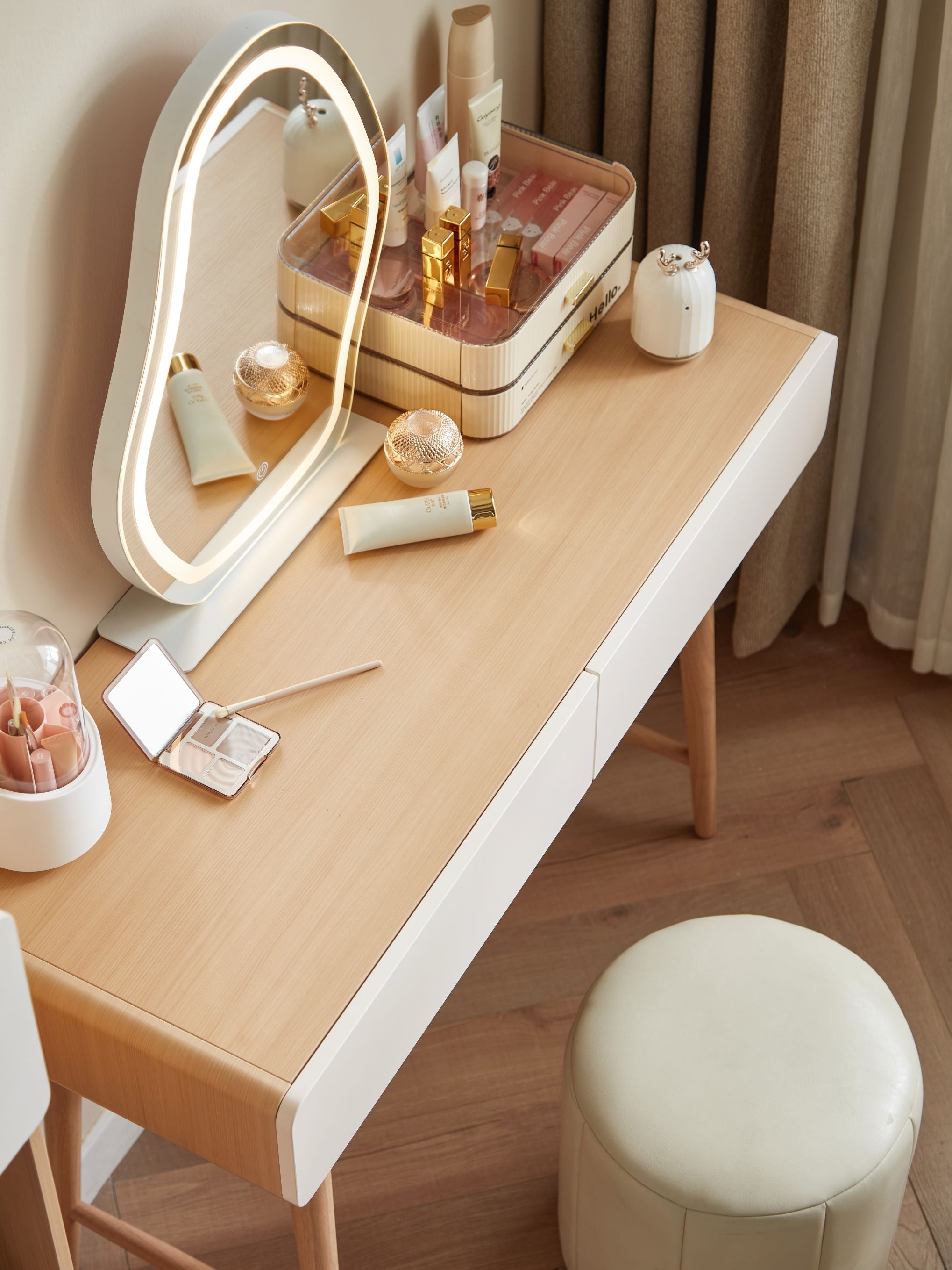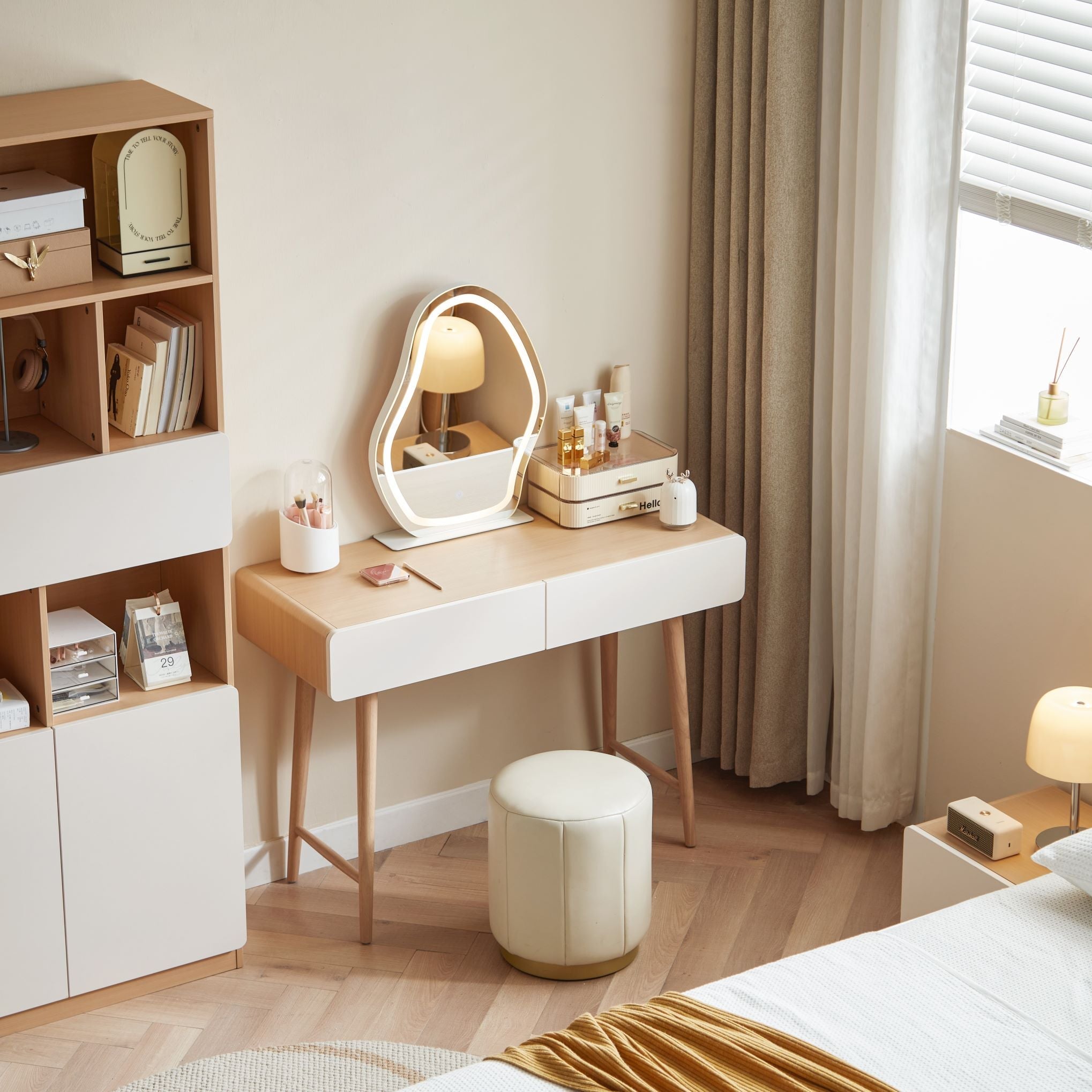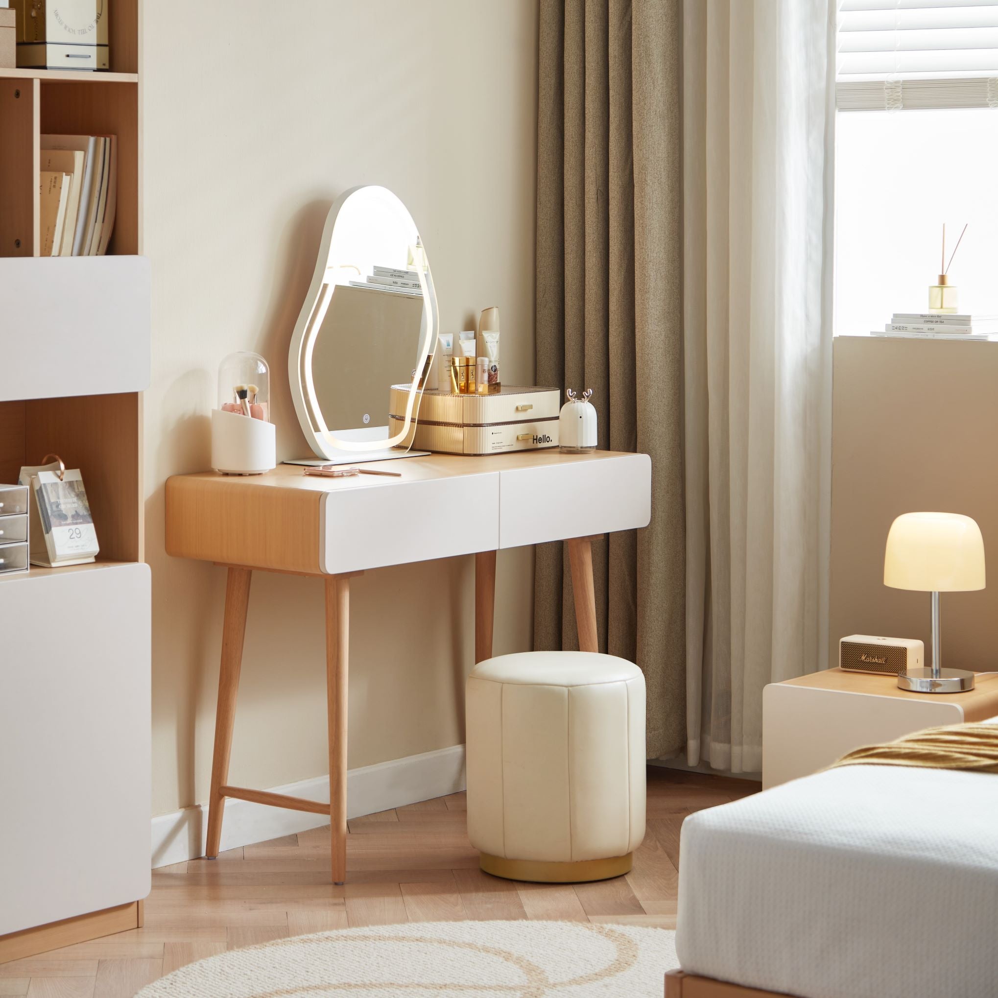 Elevate your beauty routine with this minimalist vanity set in natural wood. Featuring a sleek mirror and comfortable stool, this stylish set offers ample storage for your essentials while enhancing your space with its clean, modern design. Perfect for any bedroom or dressing area.