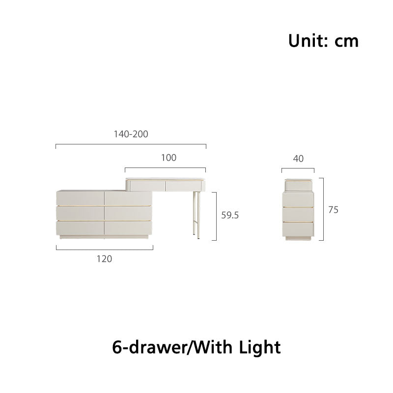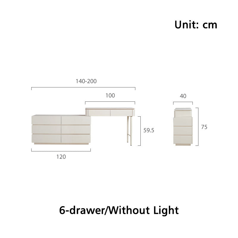- 6-drawer: (140-200)W cm x 40D cm x 75H cm